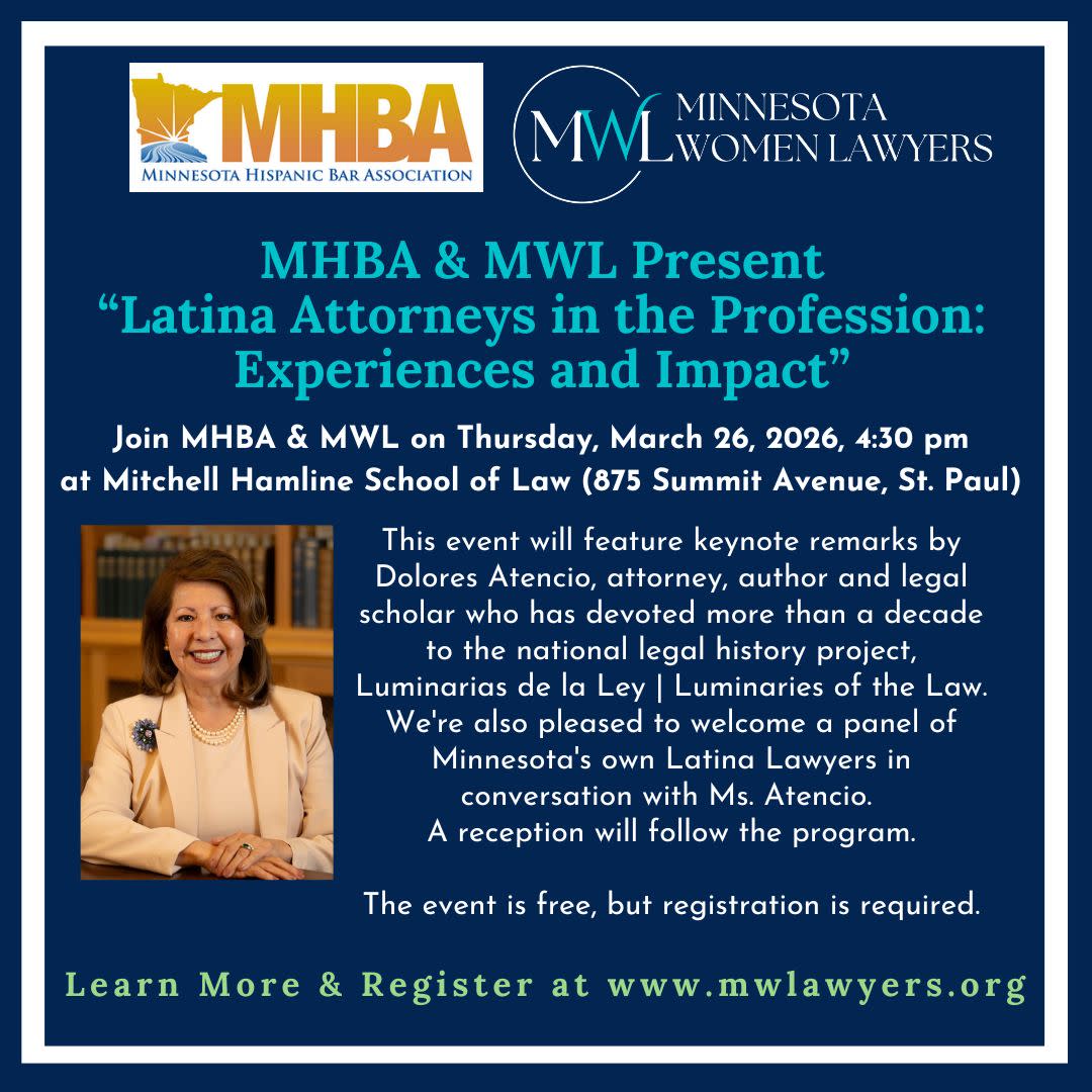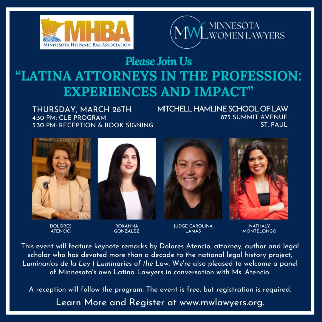 Please join the Minnesota Hispanic Bar Association and Minnesota Women Lawyers for “Latina Attorneys in the Profession: Experiences and Impact.” This CLE program and social event, to be held on Thursday, March 26, 2026, at Mitchell Hamline School of Law, will feature keynote remarks by Dolores Atencio, attorney, author and legal scholar who has devoted more than a decade to the national legal history project, Luminarias de la Ley | Luminaries of the Law. Learn more about Ms. Atencio HERE.